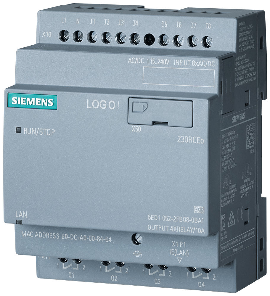 LOGO! 230RCEo, logic module, power supply / I/O: 115 V/230 V/relay, 8 DI/4 DO, without display, memory 400 blocks, modularly expandable, Ethernet, integrated web server, data log, user-defined web pages, standard microSD card for LOGO! Soft Comfort V8.4 or higher, older projects executable cloud connection, MQTT in all LOGO! 8.4 basic unit