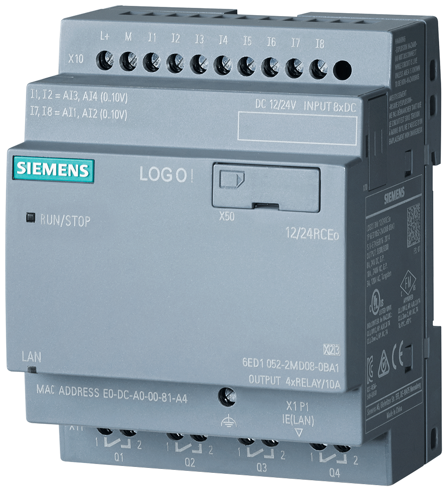 LOGO! 12/24RCEO, logic module, power supply / I/O: 12/24 V DC/relay, 8 DI (4 AI)/4 DO, without display, memory 400 blocks, modularly expandable, Ethernet, integrated web server, data log, user-defined web pages, standard microSD card for LOGO! Soft Comfort V8.4 or higher, older projects executable cloud connection, MQTT in all LOGO! 8.4 basic units